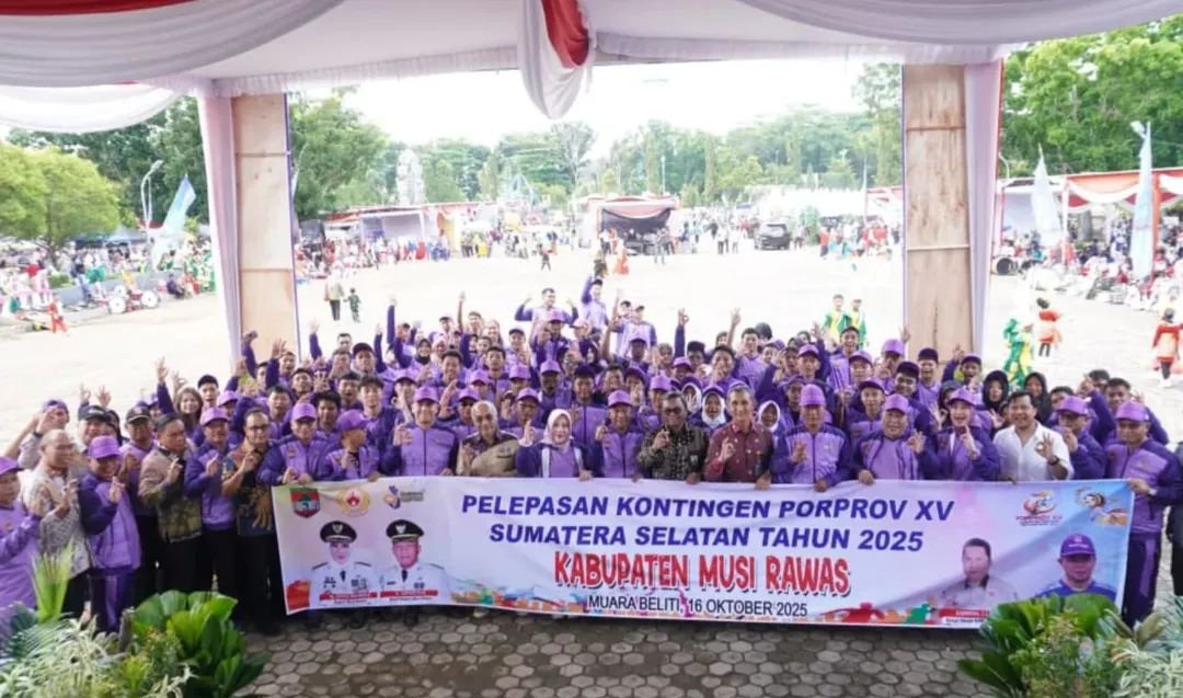 ICNEWS – MUSI RAWAS – Bupati Musi Rawas Hj Ratna Machmud menghadiri Pelepasan Kontingen PORPROV XV Sumatera Selatan di Kabupaten Musi Rawas bertempat di Taman Beregam Muara Beliti, Kamis (16/10/2025).