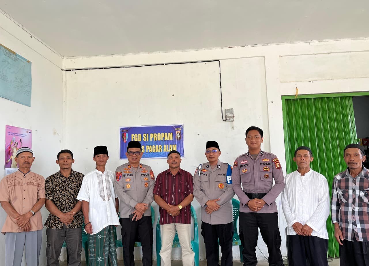 ICNEWS – PAGAR ALAM – Polres Pagaralam melalui Unit Propam menggelar Forum Group Discussion (FGD) yang dipimpin oleh Kasi Propam AKP Edy Syamputra bersama Kanit Provost Aiptu Iman Setiawan, SE. Kegiatan ini dihadiri oleh ketua RW, RT, tokoh agama, serta tokoh masyarakat sebagai bentuk silaturahmi dan komunikasi bersama.