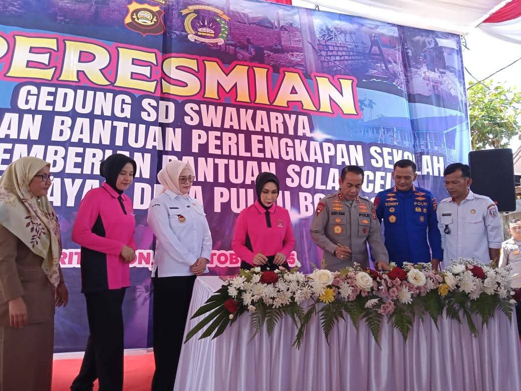 ICNEWS – BANYUASIN I – Wakil Bupati Banyuasin, Netta Indian, SP bersama dengan Kapolda Sumsel, Irjen Pol. Andi Rianto R. Djajadi, S. I. K., MH didampingi oleh Ketua Bhayangkari Daerah Sumsel, Ny. Dewwy Andi Rian meresmikan Gedung Sekolah Dasar Swakarya Desa Pulau Borang, Kecamatan Banyuasin I, Rabu (29/10/2025).